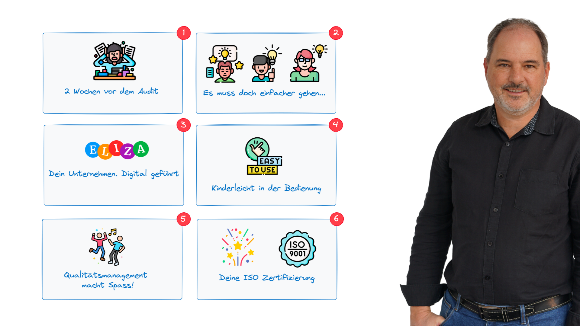 Die ELIZA AG und ihre Partnerfirmen bieten umfassende Unterstützung und Schulung bei der Einführung von ELIZA. Du und dein Team werdet eingehend in die Nutzung und die verschiedenen Funktionen der QM-Lösung eingeführt. Du kannst dich jederzeit an einen kompetenten Ansprechpartner wenden und erhältst Hilfe bei Fragen oder Problemen. So wird der Umstieg auf ELIZA zum Erfolg und deine Prozesse werden optimal digitalisiert.